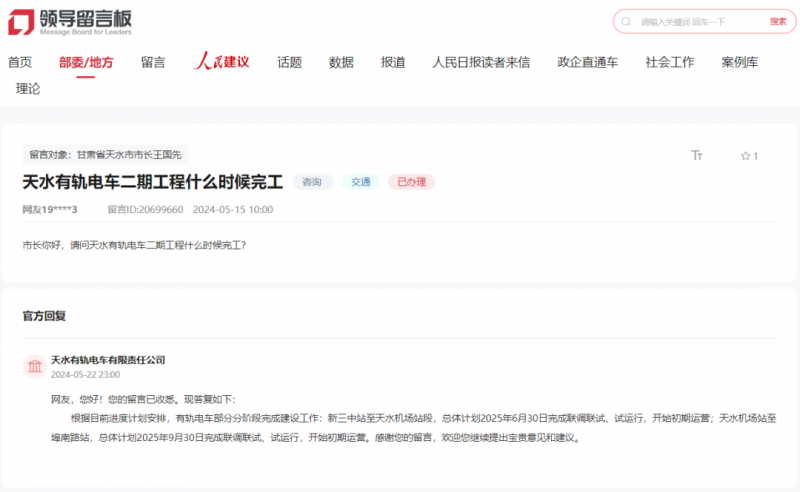 5月22日,5月22日,总体打算2025年9月30日完成联调联试、试运转,天水有轨电车无限义务公司答复网友天水有轨电车二期工程什么时候落成?按照目前进度打算放置,有轨电车部门分阶段完成扶植工做:新三中坐至天水机场坐段,有轨电车部门分阶段完成扶植工做:新三中坐至天水机场坐段,总体打算2025年6月30日完成联调联试、试运转,天水机场坐至埠南坐,有轨电车部门分阶段完成建...起头初期运营。按照目前进度打算放置,起头初期运营;天水有轨电车无限义务公司答复网友天水有轨电车二期工程什么时候落成?按照目前进度打算放置,起头初期运营。总体打算2025年6月30日完成联调联试、试运转,